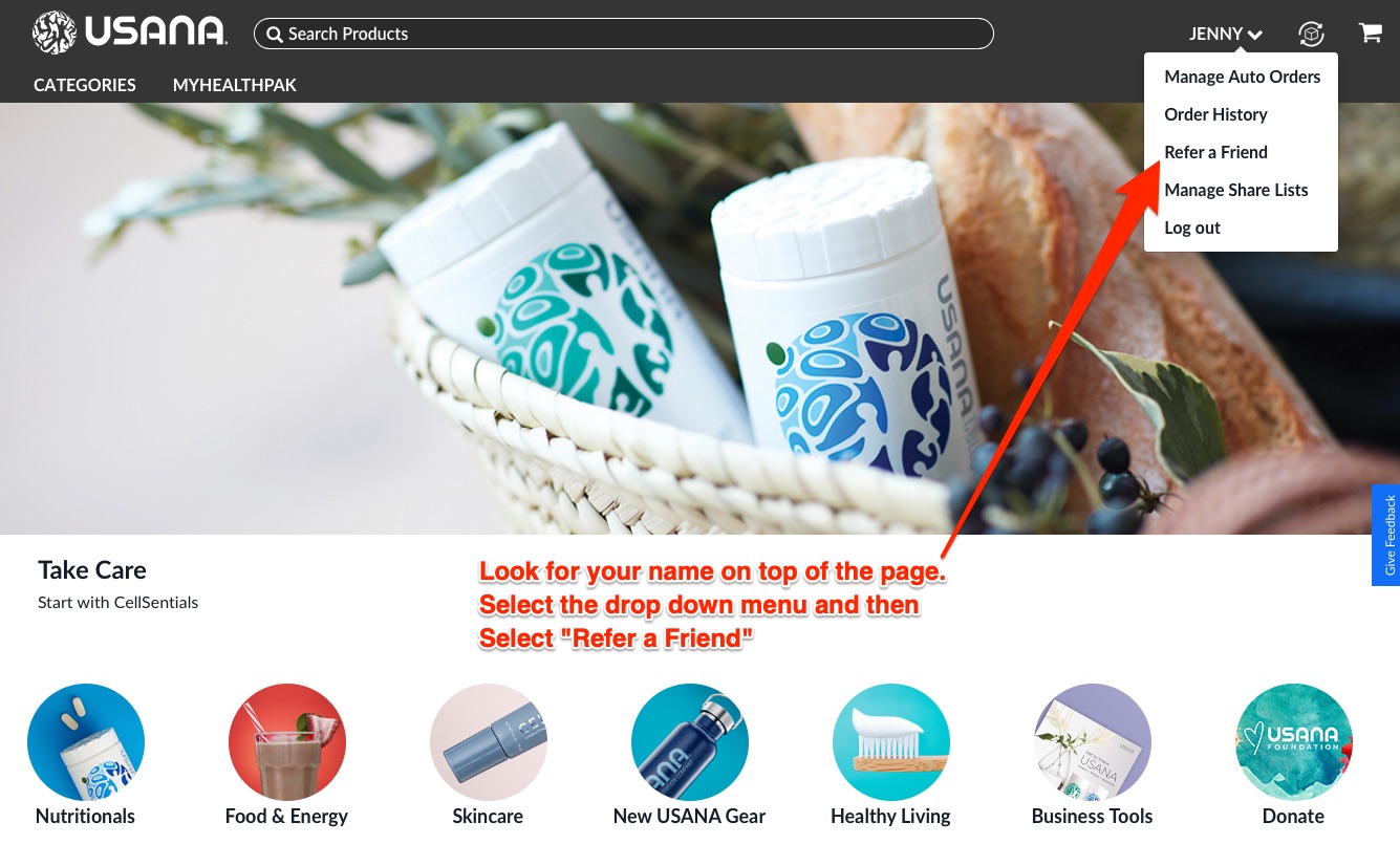 Once you have created your account, follow the screen print examples below to start referring USANA products towards rewards.