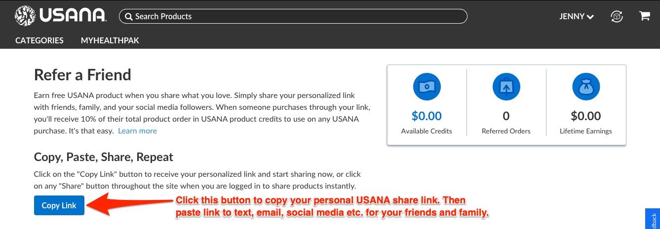 You copy your USANA product link from the referral management page in your VIP customer account and send it to your friend Jenny. Using the link, Jenny places a product order for $125 USD. You will receive $12.50 in product credits in your account to use on a future USANA order. If Jenny decides to order every month or every other month then she will receive an additional discount of 10% and you will earn 10% of her product orders in USANA product credits. It's a win-win for both of you!